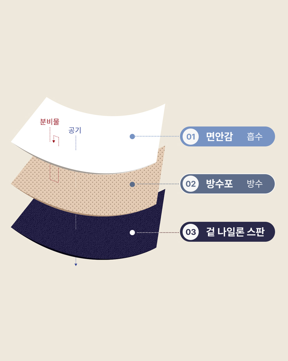 3중 안심 레이어 기술로 방수력은 더하고 착용감은 가볍게 만들었습니다.