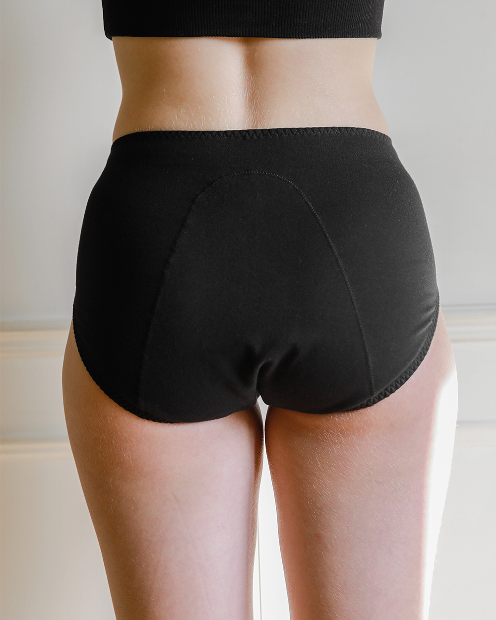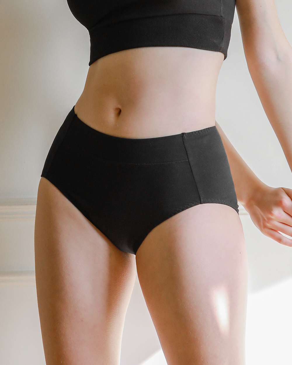 배꼽 선까지 여유롭게 올라오는 기장이 아랫배를 안정적으로 덮어줍니다.