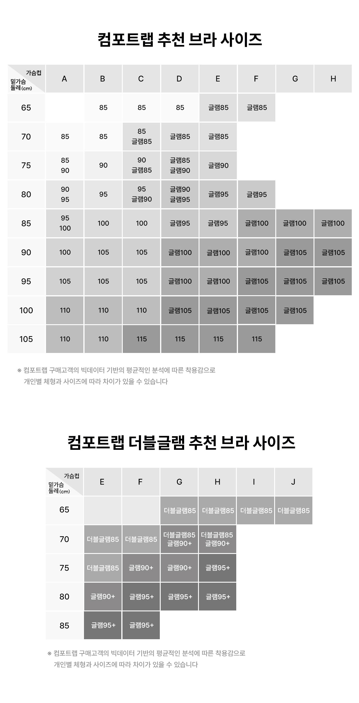 컴포트랩 빅데이터 분석 기반의 평균 추천 사이즈입니다.